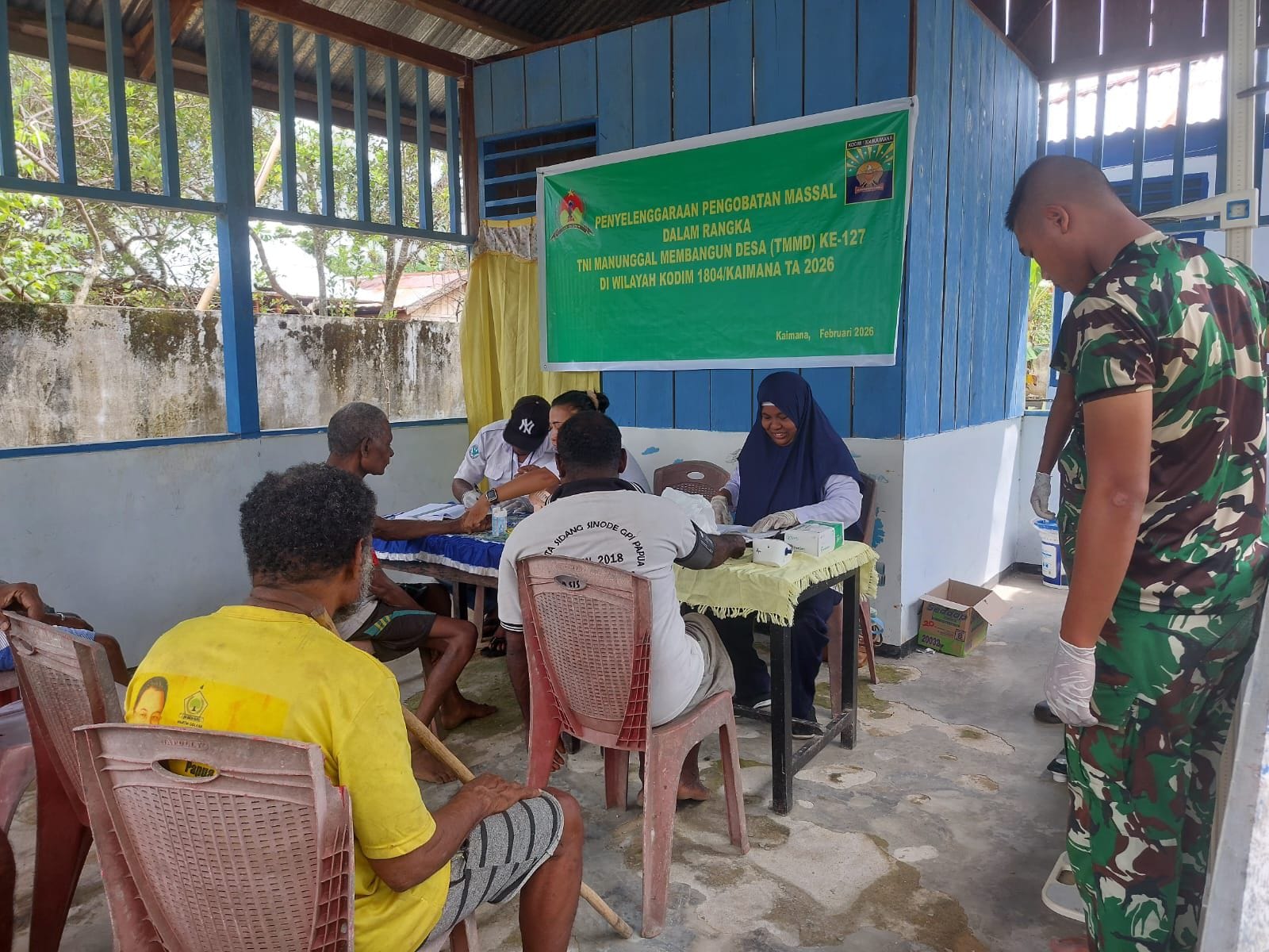 Kaimana PB – Tak hanya fokus pada pembangunan infrastruktur, program TNI Manunggal Membangun Desa (TMMD) ke-127 yang dilaksanakan oleh Kodim 1804/Kaimana jajaran Kodam XVIII/Kasuari juga menyentuh langsung kebutuhan dasar masyarakat melalui kegiatan non fisik, Kamis (27/02/2026) Satgas TMMD kembali melaksanakan kegiatan pengobatan massal di Kampung Sisir, Distrik Kaimana, Kabupaten Kaimana.